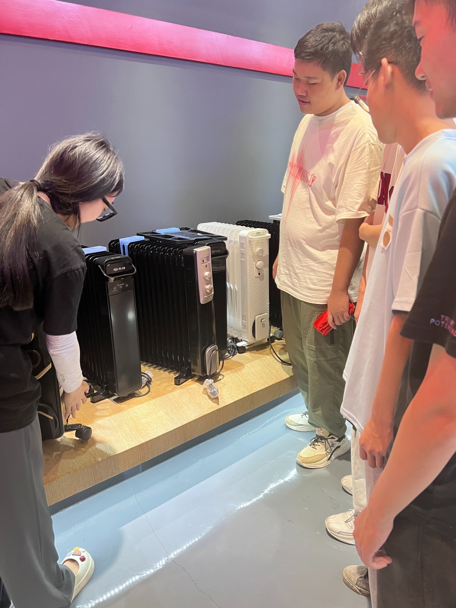 工作人員講解先鋒油汀的演變進程,從一代直板到二代S型再到三代蜂窩型熱浪片體的區別和差異,以及他們的發熱原理和不同片體的散熱效果差異。